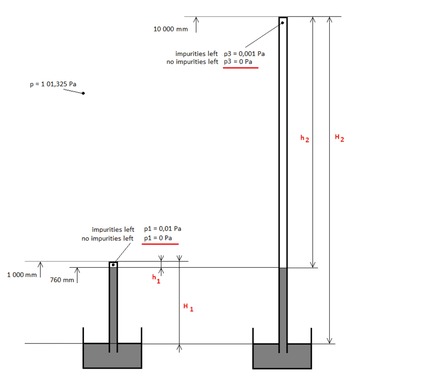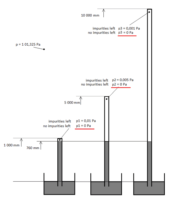 Participants express varying assumptions about the nature of impurities and their effects on vacuum pressure, as well as the theoretical versus practical implications of height in vacuum systems. There are unresolved mathematical steps and dependencies on definitions that influence the discussion.