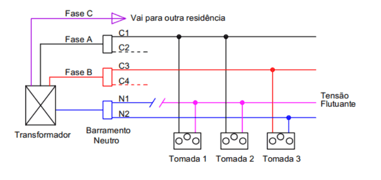 Now, the neutral opened right after the neutral bar in N1, affecting C1 and the two outlets that belong to this circuit. If you put a load in outlet 1, the potential of phase A will be transferred to N1 that is connected in the outlets. However, there will be no voltage because there is no potential diference and a multimeter in outlet 2 would register 0 V.Any device pluged in outlet 2 won't work. Outlet 3 will work normally.