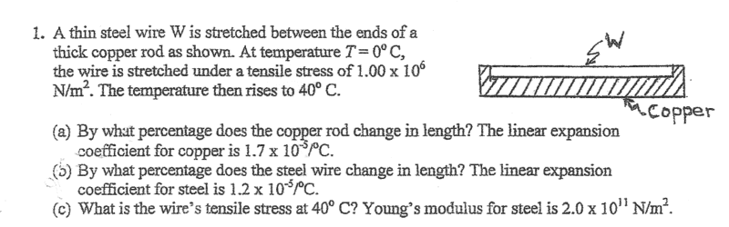 For part a, I used the coefficient of linear expansion for copper and the change in temperature to find the change in length (0.068%). I thought part b had the same answer. The two are attached, and I would imagine that the elongation would be controlled by the thick rod rather than the thin wire. For part c , I found the length the natural strain of the wire due to thermal expansion (0.048%). I then took the difference between the actual strain and the natural strain and multiplied by young's modulus to find the additional stress (2.4*10^7 N/m^2). I then added that to the original stress (1.00*10^6 N/m^2) to get 2.5*10^7 N/m^2. Is this the correct approach? Thanks.