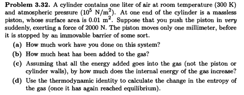 $$nC_v\Delta T=-P_{ext}\Delta V$$where, for this constant-external-force problem (with ##P_{ext}## constant) with $$P_{ext}=2000N/0.01m^2=200000Pa$$ The number of moles of air is given by the ideal gas law: $$n=\frac{P_0V_0}{RT_0}=\frac{10^5(1)}{(8314.)(300)}=0.0401\ moles$$ The molar heat capacity of the air is: $$C_v=2.5R=(2.5)(8.314)=20.785\ \frac{J}{mole.K}$$The work done by the gas on the surroundings is:$$W=P_{ext}\Delta V=-(200000)(0.001)(0.01)=-2 J$$So the temperature rise is: