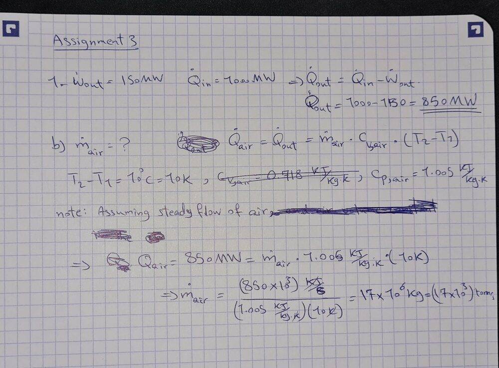 The discussion revolves around calculating the required mass flow for cooling in a thermodynamics problem, specifically related to cooling towers and air cooling systems. Participants explore the calculations involved, assumptions made, and the realism of the results obtained.