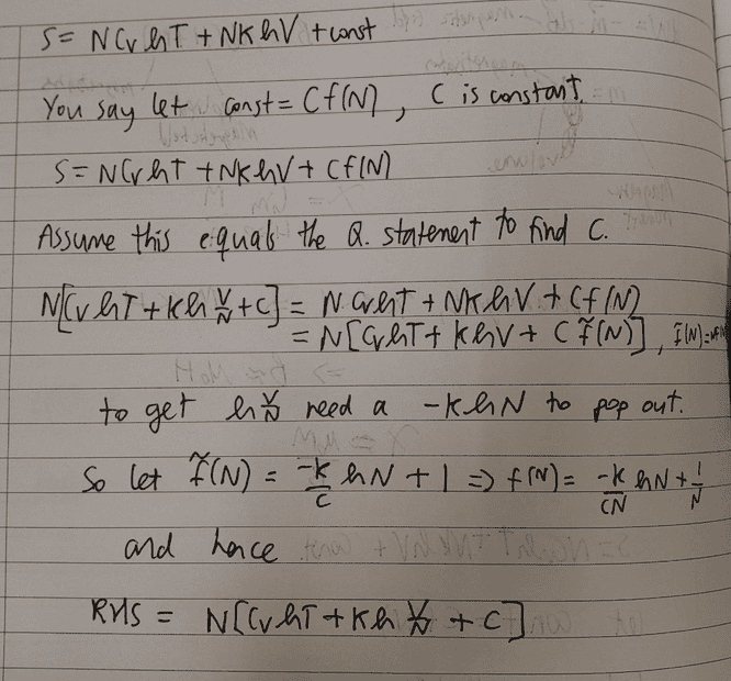 The discussion centers on deriving the expression for entropy, S, as a function of temperature (T), volume (V), and the number of particles (N) in the context of thermodynamics. Participants clarify that the integration constant in the entropy equation can depend on N, despite the problem stating that C should be a constant for a specific particle type. The final consensus is that while C must remain independent of N, the integration constant can be expressed as a function of N, allowing for a valid solution that aligns with the problem's requirements.