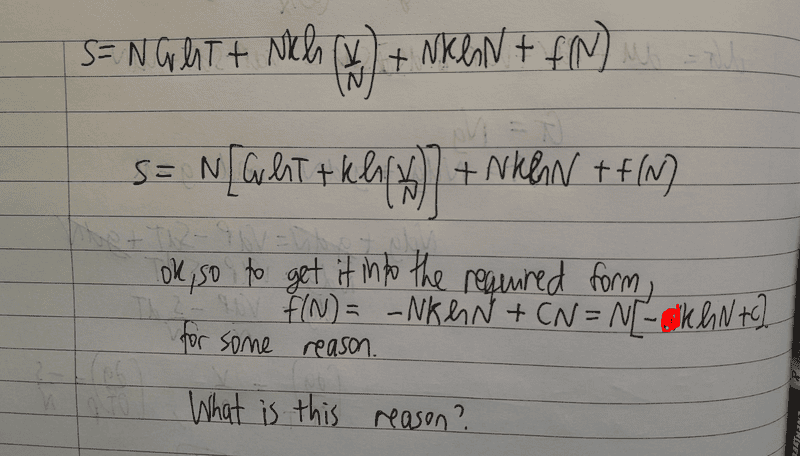 I have an issue with (b). What I did was simply integrate ##dS##. It's a perfect gas, so, $$\left(\frac{\partial E}{\partial T}\right)_V=NC_V$$ and $$\left(\frac{\partial E}{\partial V}\right)_T=0$$ Next I used the relation that ##PV=NkT## to get ##\frac{P}{T}=\frac{Nk}{T}##, and after integrating I got $$S=NC_V \ln T + Nk \ln V + const$$ I understand that I could substitute ##Nk\ln V = Nk\ln\frac{V}{N}+Nk\ln N##, but then the constant depends on ##N## and in the problem statement, it says that ##C## is a constant for the particle type of particle, so it shouldn't depend on the number of particles in my opinion (##N##). Thank you