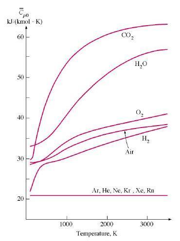 2) I find it quite confusing how ideal gasses and realistic ones are used through each other. I'm uncertain about the definition of temperature. So temperature only is proportional to the internal energy with ideal gasses? Temperature only says something about the moving of the particles, right? And the internal energy also says something about the intermolecular forces. Does temperature also include vibration and rotation? How come there are different specific heats? Is this due to the presence of realistic gasses? Would it be a constant for ideal gasses? And are they different because the intermolecular forces are different + different masses?