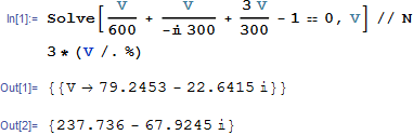 (V-9)/600 + V/(-j300) + (V+2V)/300 = 0?