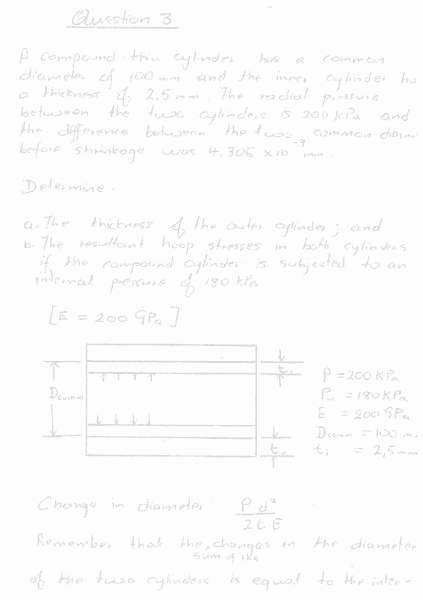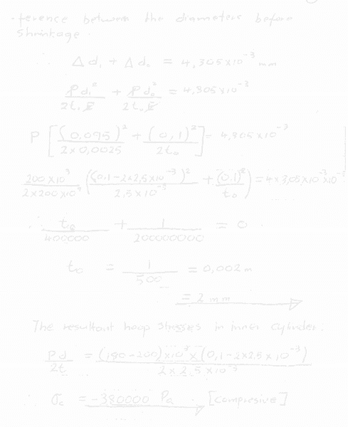 The discussion revolves around the thickness of a cylinder in a compound thin cylinder setup, focusing on the relationship between the inner and outer cylinders, their diameters, and the effects of pressure and thermal expansion. The problem involves understanding the interference between the diameters before shrinkage and how this relates to the material properties and dimensions of the cylinders.