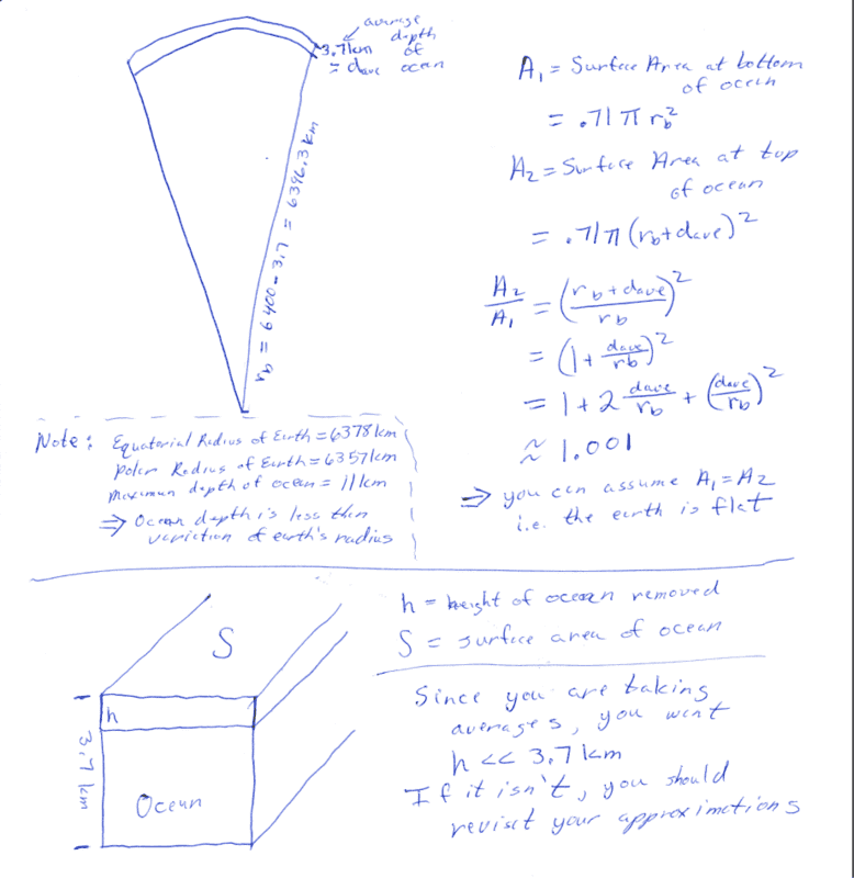 Should one also consider the volume of water being evenly spread over the surface area of the Earth, finding how many million litres per km^2. From this one could convert from litres per km^2 to m^2 to approximate spreading this over a km^2 of Earth to find how much the water level would fall by.