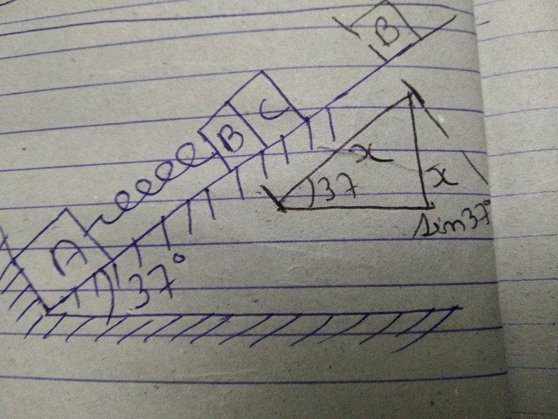 The discussion revolves around a physics problem involving three blocks and a spring on an inclined plane, focusing on the application of the Work Energy Theorem and the calculation of work done by the spring. Participants are exploring concepts related to energy conservation, tension in the spring, and the dynamics of the blocks on the incline.
