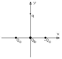 Two charges Qc and -Qc (Qc = 7 µC) are fixed on the x-axis at x = -6 cm and x = 6 cm, respectively. A third charge Qb = 1 µC is fixed at the origin.