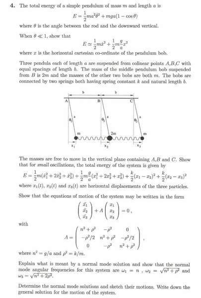 I am fine up to the point where I have to express in matrix form. My method was, given the equation for the energy, to put this in matrix form and then recover the equations of motion from there (by differentiating and setting the result to zero since total energy constant) . When I divide by ##m/2## in the matrix I recover some terms, but in particular the middle entry I have a missing factor of 1/2 (reason is that the mass of the middle pendulum has a mass of ##2m## - so I don't understand why the solution says otherwise). Also missing factors of 1/2 on entries (1,2) and (3,2). All I have done is put the given expression into matrix form. Is this a viable method? It seems so. ( I would have posted my matrices but when I tried the latex was very ugly and I haven't found a way to get the matrices to be all together rather than one every line)