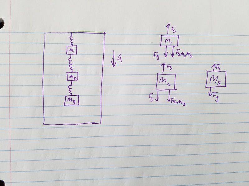 Three masses (m1=3.2, m2=9.6, and m3=6.4) hang from three identical springs in a elevator with a spring constant of 349N/m. The elevator is moving downwards at -3.7m/s and accelerating downwards at