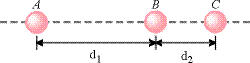 The masses of these particles are mA = 379 kg, mB = 500 kg, and mC = 140 kg. d1 = 0.558 m and d2 = 0.279 m. Calculate the magnitude of the net gravitational force acting on particle A