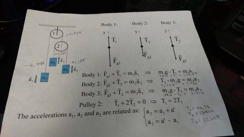 Initially i used a=((8-3)/(3+8))9.8 to figure out a1 giving me its acceleration of -4.455 m/s^2, I initially tried plugging this into the formulas given and that would give incredibly high values for a2 and a3 and a high value for the tension. So i tried using it as a positive for the right side of the system moving up. which actually gave me the tension i verified with calculators(ive spent hours on this now and beating my head into the wall.). From there i used this value to try and determine the rest, however a' never matchs for a2 and a3 and the equations for body 2 and 3 never work out. I also attempted to figure out the acceleration of m2 and m3 on their own and then use that acceleration plus a1 and that didnt work either. At this point I'm completely lost, I didnt have any issues with my homework but this is really bugging me that i can't figure this one out.