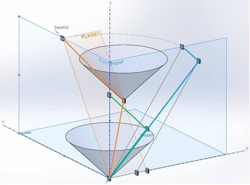 The orange light beam is 2 second tick of moving (along Y axe, in plane 1) clock. The orange beam is intersection of plane 1 and lightcone surface.
