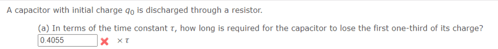 - A capacitor with an initial charge q0 is discharged through a resistor. In terms of the time constant tau, how long is required for the capacitor to lose the first one-third of its charge?