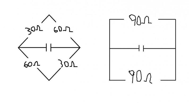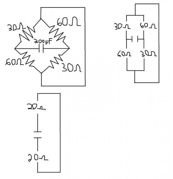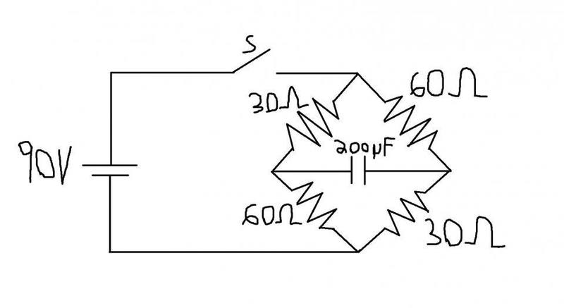 So first thing I did was I set (1/2)Q2/2C = q2/2C then i replaced q2 for Q2e-2t/RC so I get (1/2)Q2/2C = Q2e-2t/RC/2C I cancel out the like terms and I am left with 1/2 = e-2t/RC I than get rid of the e so I get ln(1/2) =-2t/RC then i get -ln(2) = -2t/RC getting me t = RCln(2)/2 and now this is were i got confused I know C = 200E-6 F but i don't know what R is suppose to be, I think it is suppose to be 90Ω since the 30Ω and the 60Ω resistors connect together at where the capacitor is.