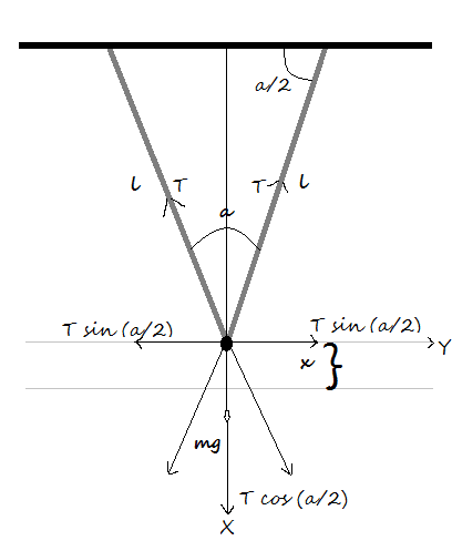 $$T = \frac {2\pi} {\sqrt {\frac {g} {l \cdot cos {\frac a 2}}}} = 2\pi \sqrt {\frac {l \cdot cos {\frac a 2}} {g}}$$