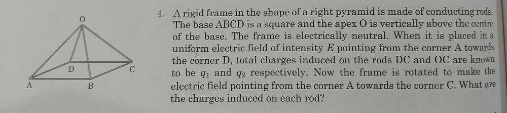 - A rigid frame in the shape of a right pyramid is made of conducting rods The base ABCD is a square and the apex O is vertically above the centre of the base. The frame is electrically neutral. When it is placed in a uniform electric field of intensity E pointing from the corner A towards the corner D, total charges induced on the rods DC and OC are known to be q1 and q2 respectively. Now the frame is rotated to make the