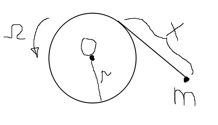 A disk of radius ##r## is wrapped with an inextensible massless string. A particle of mass ##m## is attached to the end of the string. The disk rotates about its center ##O## with angular velocity ##\Omega=const##. The whole system is placed on a smooth horizontal table.