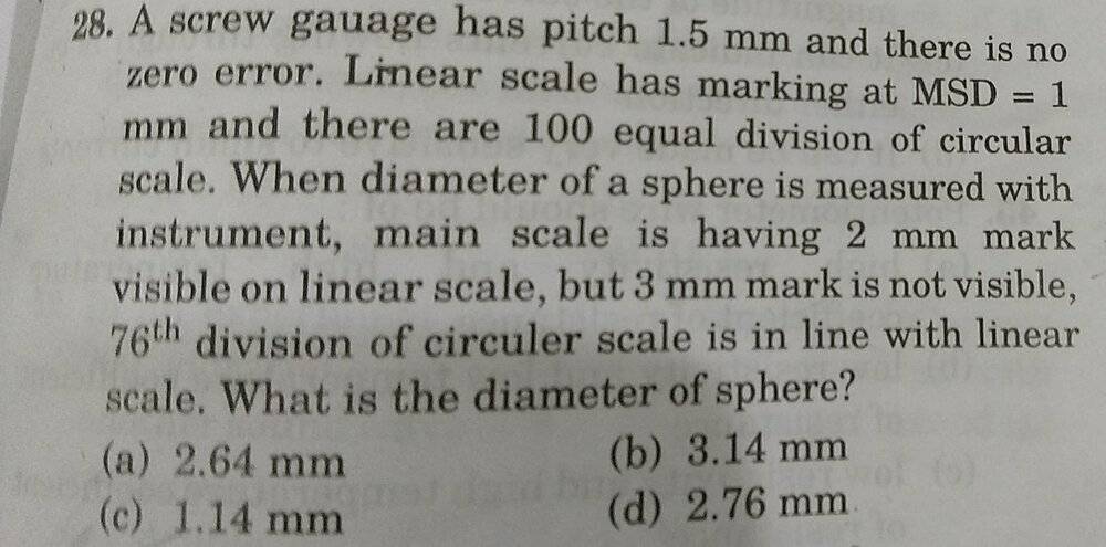 - A screw gauge has pitch 1.5 mm and there is no zero error. Linear scale has marking at MSD = 1 mm and there are 100 equal division of circular scale. When diameter of a sphere is measured with instrument, main scale is having 2 mm mark visible on linear scale, but 3 mm mark is not visible, 76th division of circular scale is in line with linear scale. What is the diameter of sphere?