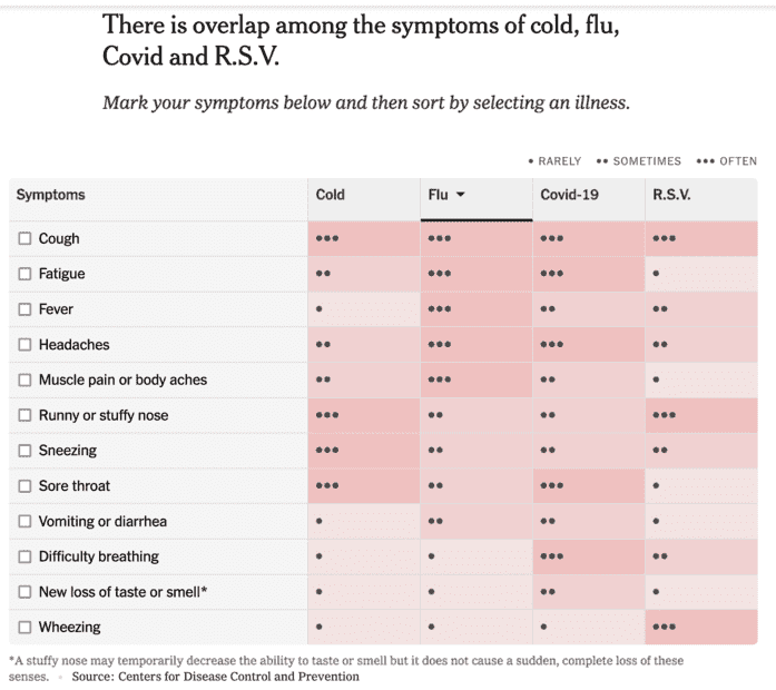That is interesting and I am sure I am not the only one who has tried to work out what they have/had last week/last month!BillTre said:Here a nice little table from the NY Times for distinguishing among illnesses: