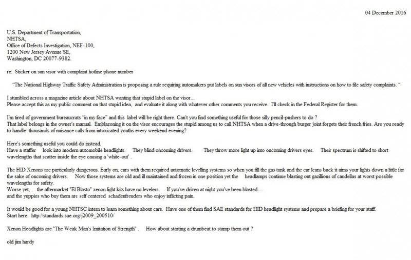 And i sent the attached letter to NHTSA in response to a recent call for comments on some silly rule.
