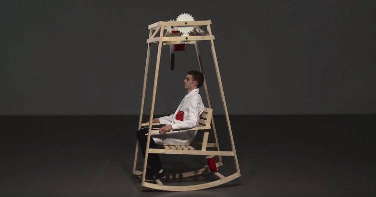 TIL that some uni students built a rocking chair that knits a woolen garment as you rock. "The motion of the chair starts a series of gears going that then proceed to process the spool of wool into a knit winter hat."