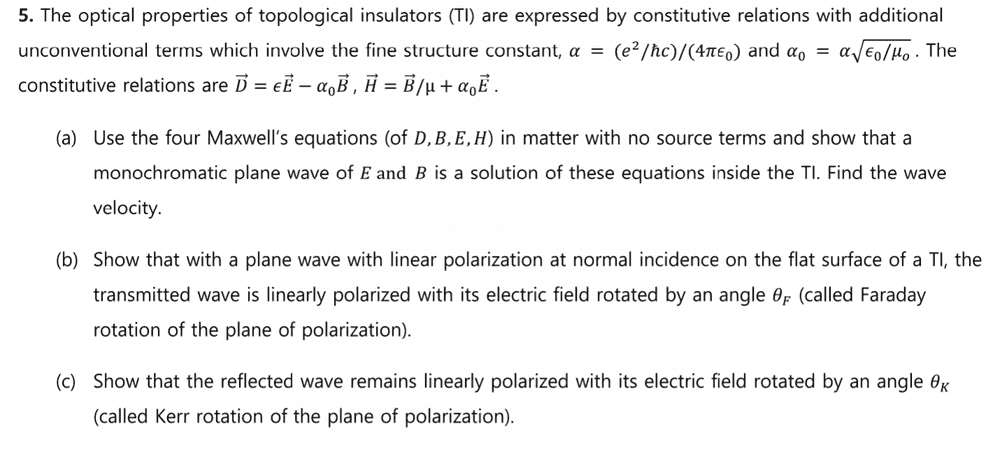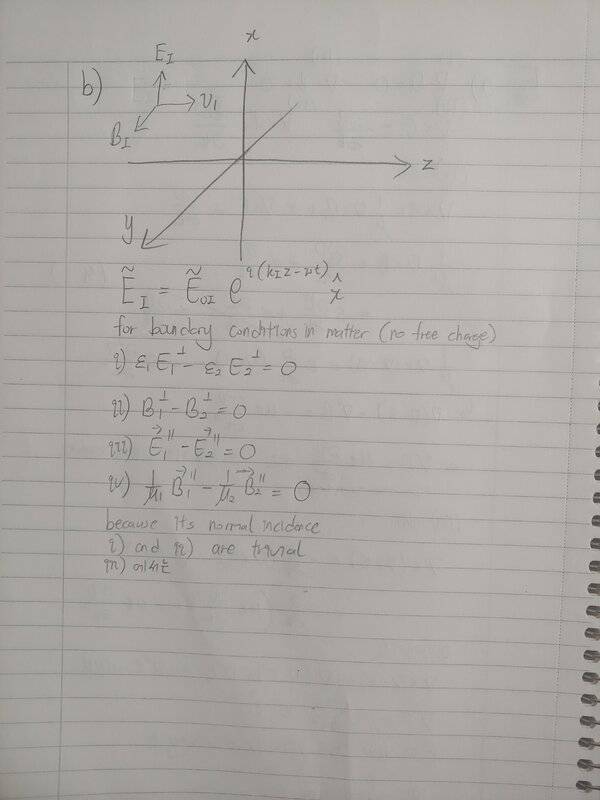I have tried to write down the boundary conditions in this case and looked into them. As conditions i) and ii) were trivial, i looked into iii) and iv) for information that I could use. But all I got was that for the transmitted wave to have an angle, the reflective wave should also have an angle (which is related to 5.c) since the boundary condition iii) states that the electric field parallel to the surface should be equal in both magnitude and direction over the two regions.