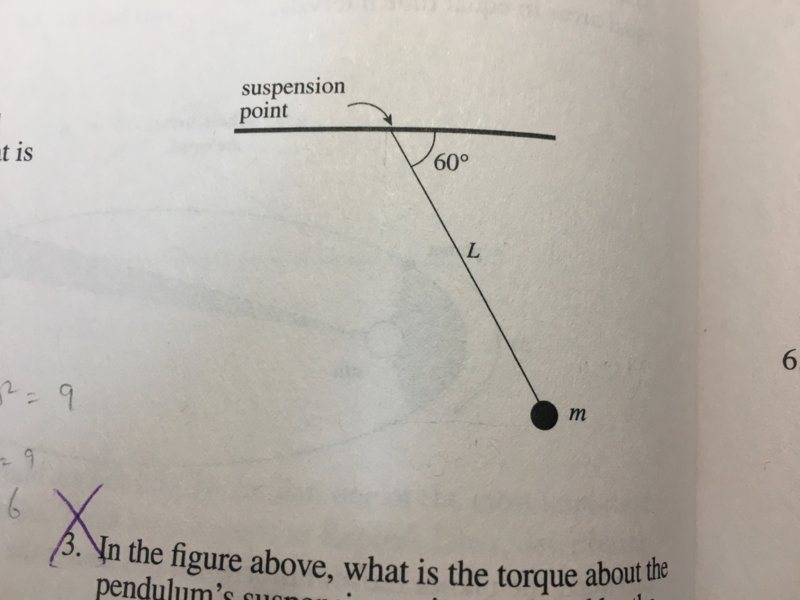In the figure attached, what is the torque about the pendulum's suspension point produced by the weight of the bob, given that the mass is 40 cm to the right of the suspension point, measured horizontally, and m=0.50kg?