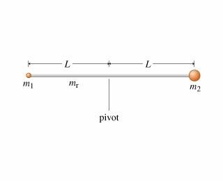 The figure shows a simple model of a seesaw and/or valves used in car engines. These consist of a plank/rod of mass m_r and length 2L allowed to pivot freely about its center (or central axis), as shown in the diagram. A small sphere of mass m_2 is attached to the left end of the rod, and a small sphere of mass is attached to the right end. The spheres are small enough that they can be considered point particles. The gravitational force acts downward. The magnitude of the acceleration due to gravity is equal to g.