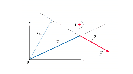 The discussion focuses on calculating the length of the moment arm and the torque about a point due to a force vector, denoted as F→F_vec. The correct expression for the moment arm is r sin Θ, where the sign of the torque τ is determined by the direction of rotation: counterclockwise (ccw) is positive and clockwise (cw) is negative. The moment arm is defined as the perpendicular distance from the line of action of the force to the point of rotation, which is crucial for accurate torque calculations. The cross product rule is also mentioned as an alternative method for calculating torque.