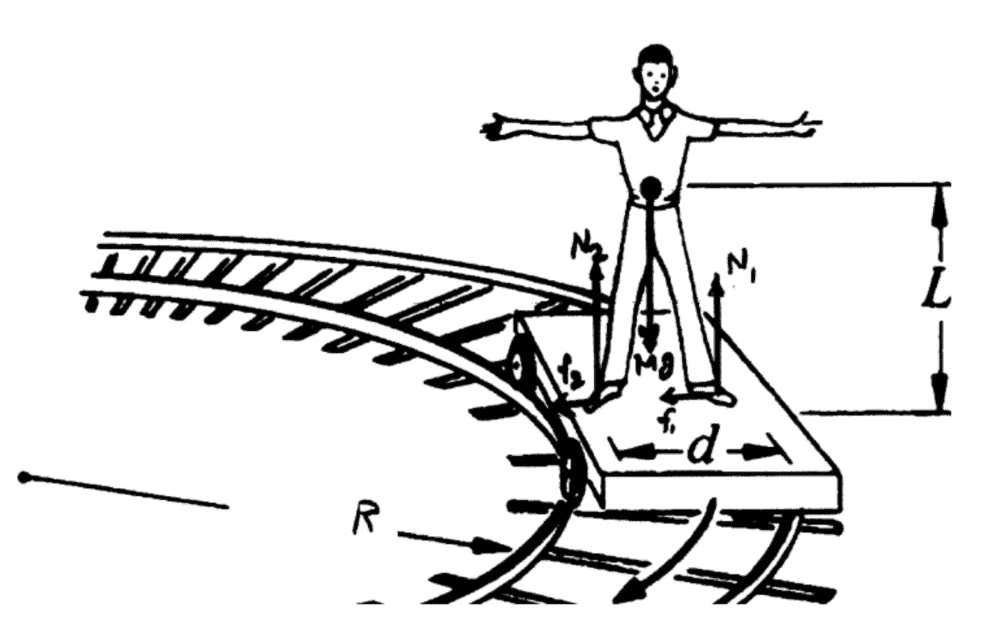 - A man of mass M stands on a railroad car that is rounding an unbanked turn of radius R at speed v. His center of mass is height L above the car, and his feet are a distance d apart. How much weight is on each of his feet?