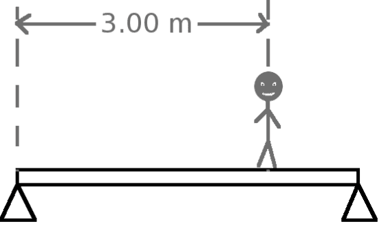 A rigid beam with a length of 4.00 m has a mass of 50.0 kg and a uniform mass distribution. It is supported at either end as seen in the figure by resting on the supports, but is not attached to them. If you call the support on the right support 2 and the support on the left support 1, a 65.0 kg person stands 3.00 m from support 1. Solve for the force applied by support 2.