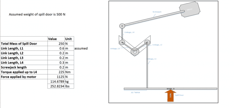 Find out the amount of force exerted by the screwjack/motor to lift the spill door upwards. The length of the different linkages is known as well as an estimate of the weight of the spill door.