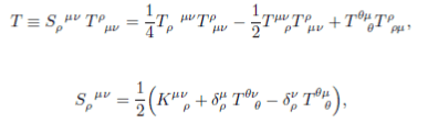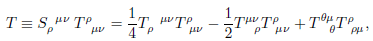 [tex]S^{\rho\mu\nu}T_{\rho\mu\nu} = \frac{1}{4} T^{\rho\mu\nu} T_{\rho\mu\nu} - \frac{1}{2} T^{\rho\mu}{}_{\nu} \ T^{\nu}{}_{\rho\mu} + T^{\alpha\mu}{}_{\alpha} \ T^{\rho}{}_{\rho\mu} .[/tex]