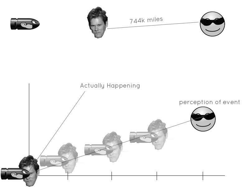 The point is... the Kevin diagram is just another mirror clock (figuratively speaking) that begins when Kevin gets hit in the face, only it's set to count different time intervals (and, so far, it's only half of the cycle). One problem with SR is that it assumes light won't conform to uniform motion, yet it uses light in uniform motion to illustrate the effects of time dilation with a mirror clock (i.e. that type of clock only exists on a graph). What, I believe, it actually illustrates is that you CAN move in relation to the speed of light, that C is not equal to C in all inertial frames of reference. Furthermore, the coordinates of an event (and it's path of trajectory) in any reference frame will always remain the same to all observers, no matter what (you only experience "motion" when you move out of this reference frame - absolute time passes, it won't wait on anything). Space won't contract and time dilation won't occur... what WILL happen is that everyone will agree on light speed and nobody will agree on time. If everyone assumes their own c' then we can all agree on time again. A quick snapshot of assumptions... (