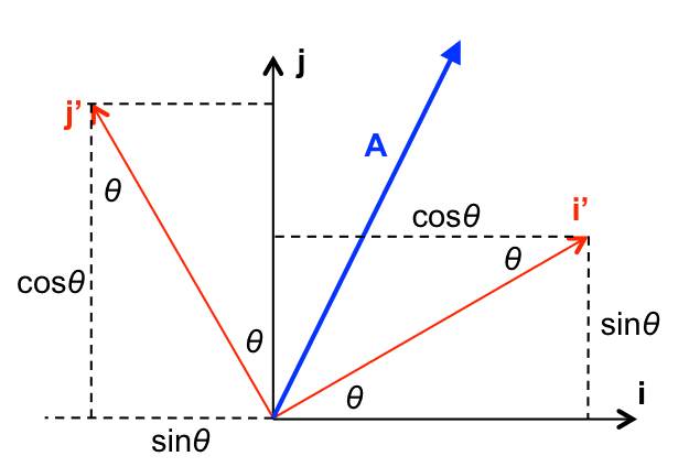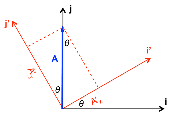 x' = xcosθ + ysinθ and y’ = xsinθ - ycosθ. More specifically, it is the negative ycos that troubles me. The way I saw it was using the prior derivations and then finally grouping the terms that matched with i' and j', you would get y' = -xsinθ + ycosθ.In the given problem, the Aycos is negative, which makes more sense to me. I really would like to understand the underpinnings of this because it's crucial moving forward. Thank you so much.