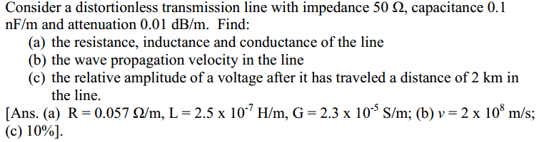 "Consider a distortionless transmission line with impedance 50 Ω, capacitance 0.1