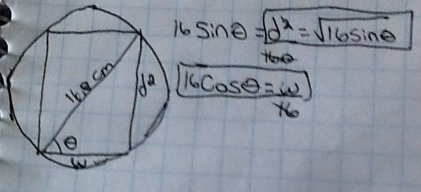 So, I figured the biggest square would use the diameter. I have to use trig functions, so, I have the d as [math]d= \sqrt{(16\sin(x))}[/math]. Then I put [math]w=16\cos(x)[/math]
