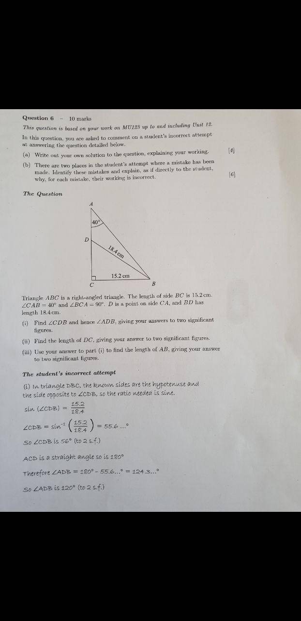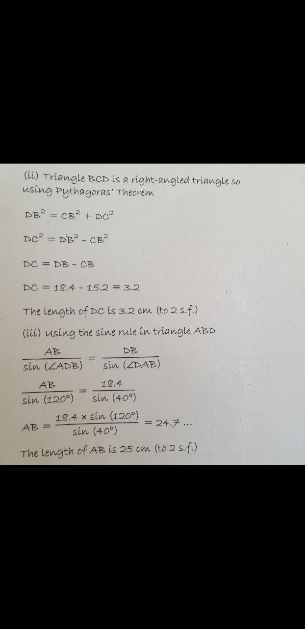 The discussion focuses on solving a right-angled triangle problem involving the lengths of sides DC, DB, and CB. It highlights an algebraic error in calculating the length of DC, emphasizing that the correct relationship is $DC^2 = DB^2 - CB^2$. Additionally, it critiques the use of a 120-degree angle for ADB due to potential rounding errors, advocating for the use of the sine function with the equation $\sin(40) = \dfrac{BC}{AB}$ to accurately determine the length of AB without inducing errors.