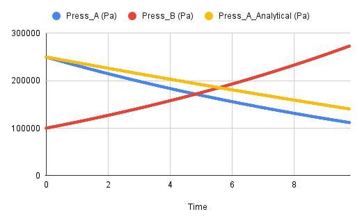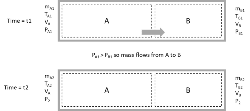 I can also structure the problem as control masses instead of control volumes. Essentially, mass A pushes into mass B, doing work Imagine a piston between the air masses. Using polytropic relationships for isentropic flow, and the relationship of total volume being constant, I can solve for P2. I can then use this P2 and the control volume relationships to solve for the changes in mass, then find other equations of state. This is fine, but feels messy and kludged.