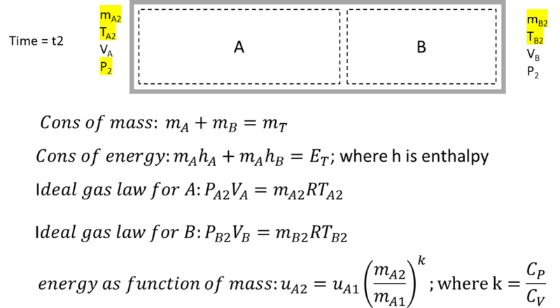 Using fixed-size control volumes, there are 5 unknowns at the final state (mA, mB, TA, TB, P2). I find 4 equations: conservation of mass, conservation of enthalpy ( that is; hA1mA1 + hB1mB1 = hA2mA2 + hB2mB2. Is this a valid equation?), and ideal gas law for both volumes at the end state. This would not be enough to solve for 5 unknowns. Is there another obvious one? I considered relationships for polytropic processes, but was not confident they apply for fixed control volumes. I did derive a 5th equation that relates internal energy to mass flow for control volume A (shown below) but I'm hesitant about it. Solving this non linear system of equations is beyond me. Perhaps you can point me in the right direction?