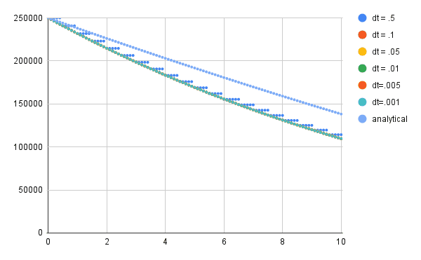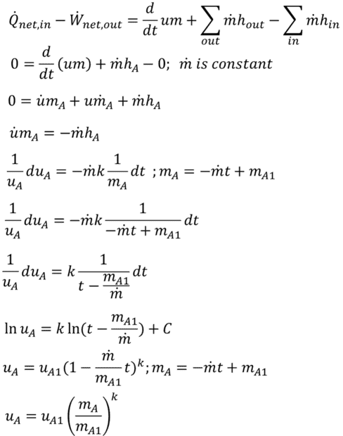 Starting with the general energy balance equation for volume A, I eliminated terms for heat flux, work, and mass flow in. I then differentiated (chain rule) um with respect to t. The m-dot term here makes no physical sense (mass does not just disappear) so is zero. Using the definition of enthalpy, the ideal gas law, the specific heat relationship u = CvT, the definition of k = Cp/Cv, and integrating both sides of this separable differential equation. I arrive at internal energy as a function of mass flow and time. assuming mass flow is constant this can be re-written as internal energy as a function of mass in the control volume. (Note: It is possible to perform this integration as du/dm rather than du/dt. The result is the same.) This is an simple, elegant equation (which I cannot verify externally). However, when using this relationship to assemble a differential equation for control volume B, I get an unwieldy equation I cannot figure out how to integrate.