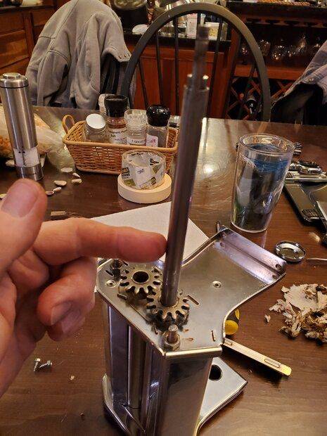 I have a Marcato Atlas 150 pasta machine that has stopped working. The crank won't turn because the rollers won't turn. The crank directly drives the near roller, which drives the far roller by interconnecting cogs. The gap between the near and far roller can be modified by turning a dial knob which changes the location of the far roller. To turn that dial you first have to pull it slightly away from the machine's case so it clears a locking nub and becomes free to turn. When you release the dial, it settles with a hole in the dial over the locking nub so that it cannot turn. A metal rod goes through the centre of the far roller and through the centre of the dial, with a squared cross-section where it goes through the dial so that the dial and rod cannot rotate relative to one another.