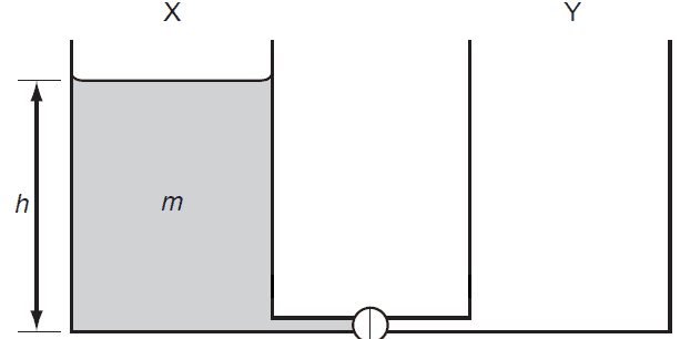 - The diagram shows two identical containers, X and Y, that are connected by a thin tube of negligible volume. Initially container X is filled with water of mass 'm' up to a height 'h' and Y is empty.