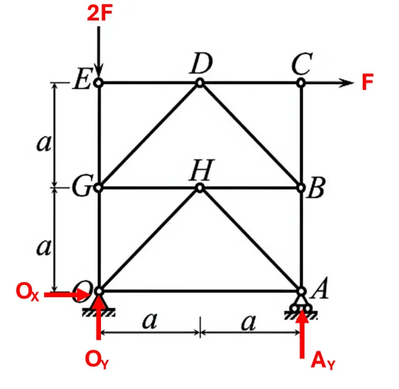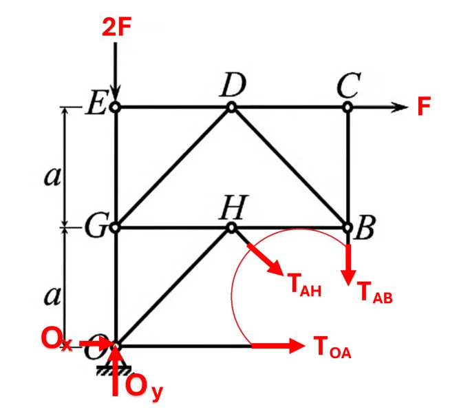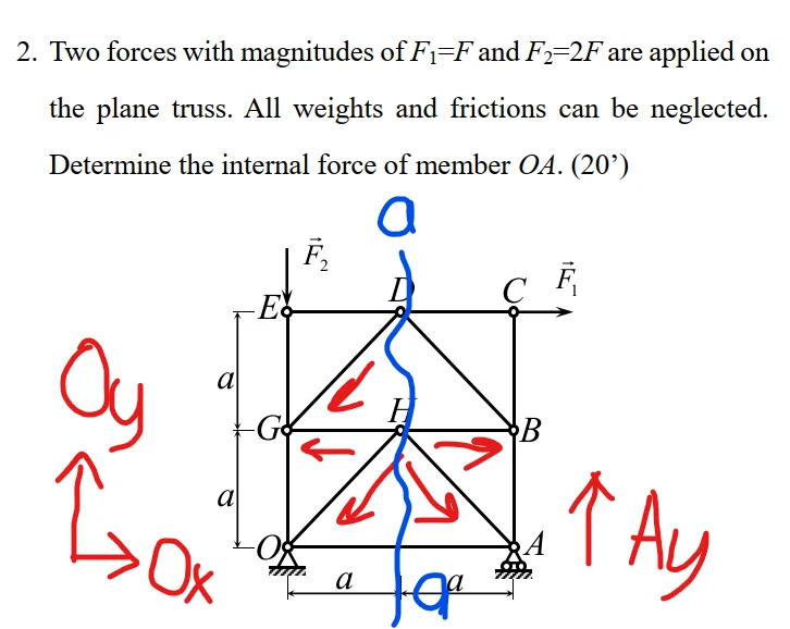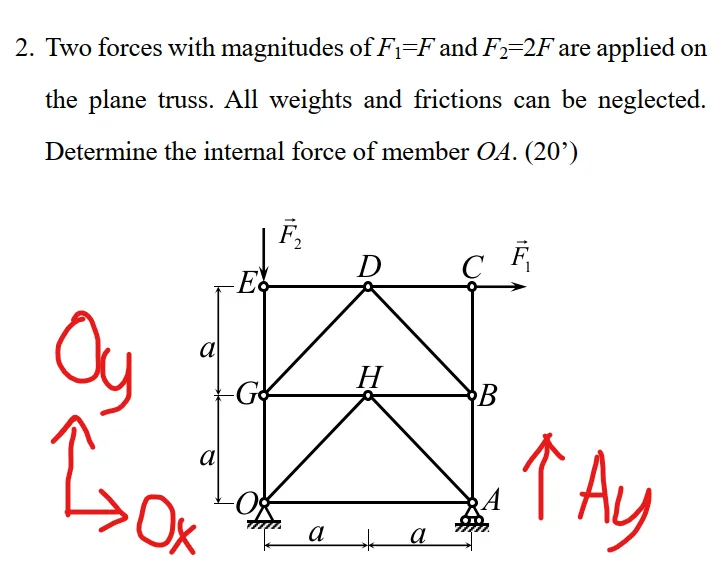 It appears you have assumed member GO has a tension of 2F and member AO has a tension equal to ##O_x##. That's wrong.