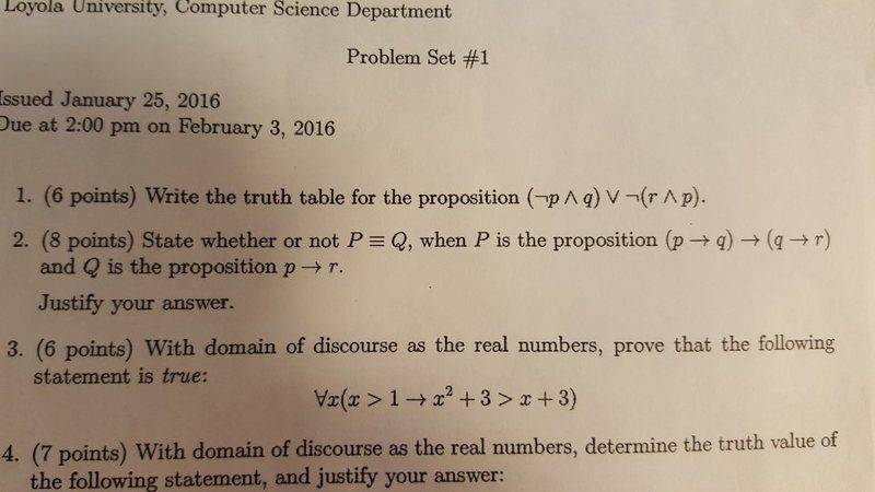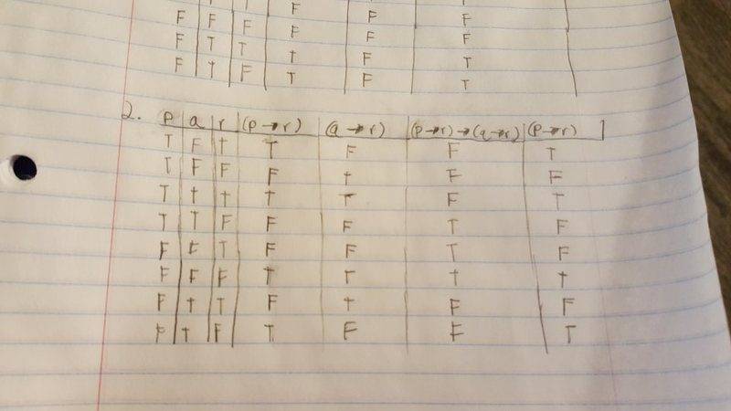 The discussion revolves around the construction and evaluation of a truth table related to logical expressions, specifically focusing on implications and equivalences involving propositions p, q, and r.
