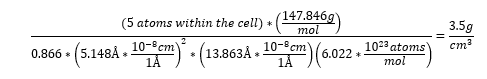The discussion centers on calculating the theoretical density of Lithium Niobate (LiNbO3) using the formula for crystalline solids. The correct theoretical density is established as 4.644 g/cm³, while the initial calculation yielded 3.85 g/cm³ due to an incorrect count of LiNbO3 units in the unit cell. Participants emphasized the importance of accounting for the different atomic weights of the three types of atoms present in the compound.