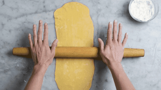 The kneading and rolling aligns the glutens and particles in the pasta. Generally, the finer the cut, the tighter (thinner) the rolling. Hang finished noodles on drying racks before cooking or storing in the refrigerator. Raviolis can rest on parchment sheets before cooking.