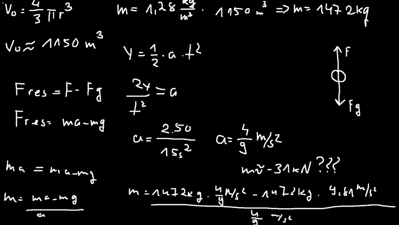 From the problem statement we can harvest figures for everything but the drag force. We can solve for ##F_d## and obtain:$$F_d = \frac{C_d \rho \mu^2 A}{2}$$We can use the average ascent velocity for ##\mu##, that is 50 meters in 15 seconds or about 3.3 m/s. ##\rho## is a given at 1.28 kg/m3. The coefficient of drag is 0.47. The relevant cross section is ##\pi r^2 \approx 132## m2. Plugging that all in we get:$$F_d = \frac{C_d \rho \mu^2 A}{2} \approx 0.5 \times 0.47 \times 1.28 \times 3.3^2 \times 132 \approx 430 \text{N}$$Assuming that I have not blundered egregiously.